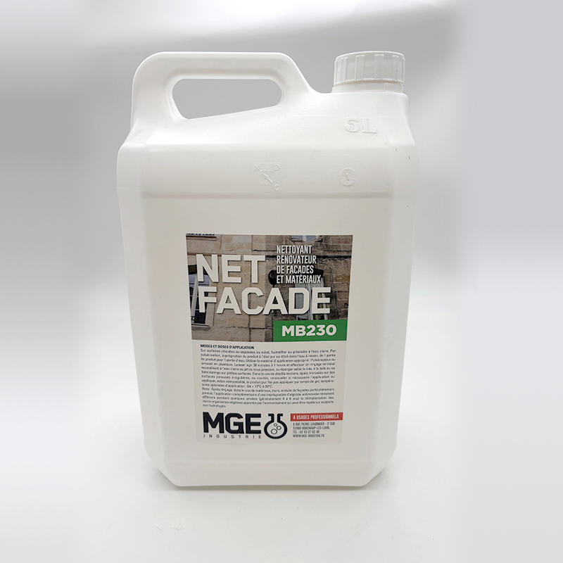 Le MB230 NET FACADE est un nettoyant rénovateur alcalin spécialement formulé pour l’entretien et la rénovation des façades et matériaux de construction. Sa formule puissante offre une action nettoyante et blanchissante rapide sur divers types de surfaces extérieures.